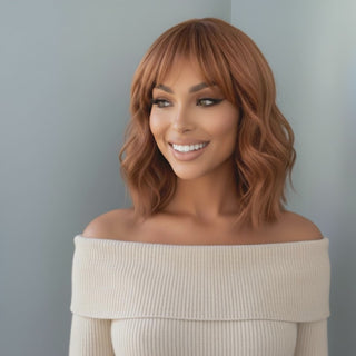 A chic, shoulder-length auburn wig with soft waves and full bangs, designed for effortless beauty and everyday wear. The warm copper-red hue adds depth and vibrance, making it the perfect choice for those who want a natural-looking redhead transformation or a fun, low-maintenance style update.  Crafted with Premium Silk Fibre, this wig mimics real hair with soft movement and a natural feel, while remaining lightweight, breathable, and beginner-friendly.