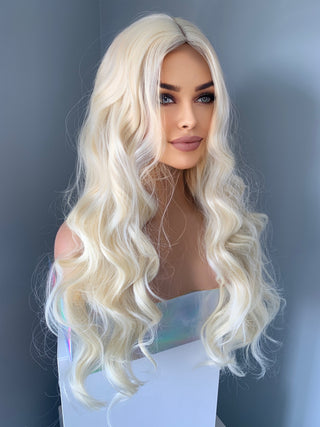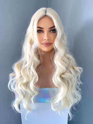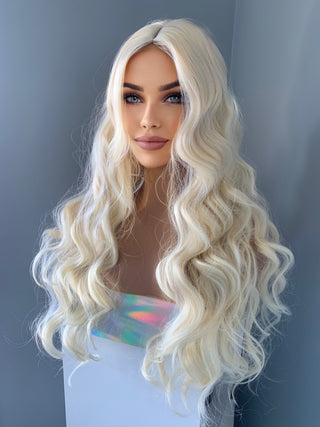 This ultra-glam platinum blonde wig brings full goddess energy. With a luxe wavy texture and face-framing centre part, it’s giving high fashion meets fairytale. The soft partial lace front blends beautifully into your hairline for a natural finish—no salon appointment needed.