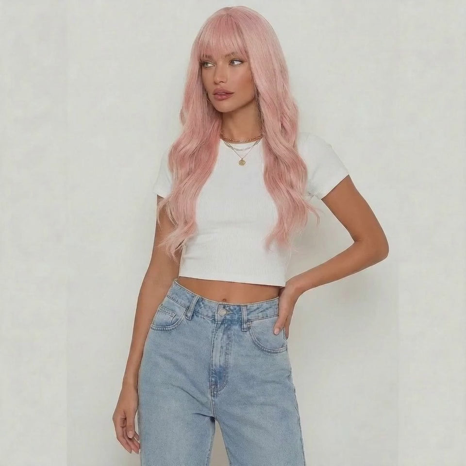 This blush pink wig features loose, flowing waves and a flattering fringe that frames your face perfectly. The pastel tone keeps it light and wearable while still giving you that fun, dreamy vibe.